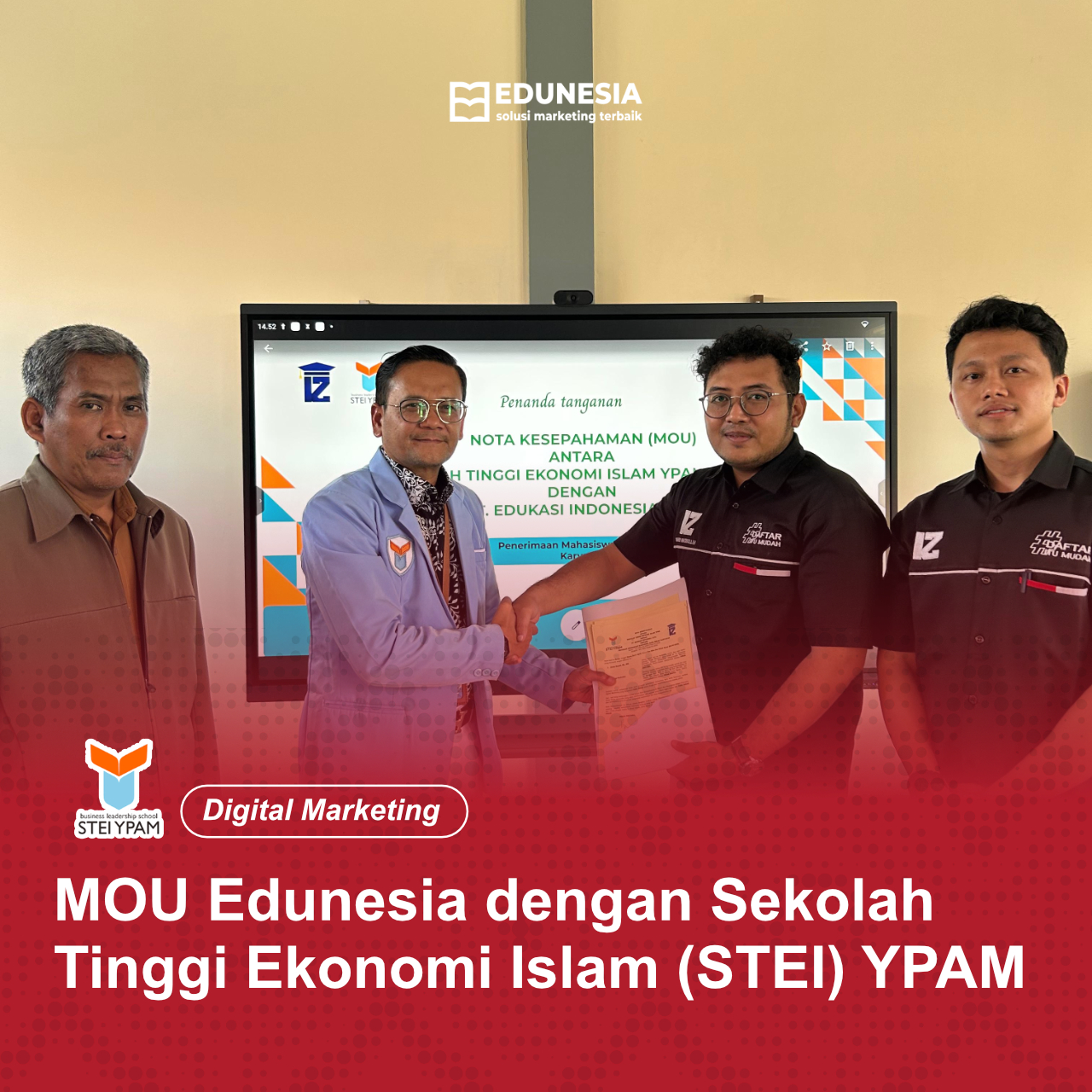 Penandatanganan MoU ini dihadiri langsung oleh Kepala Cabang STIE GICI Kampus Bekasi Bapak Aldi F Dira, SE, MM,. dan Kepala Cabang GICI Kampus Jatiwaringin Dr. Eko Yuliawan, SE, M.Si serta jajaran manajemen PT. Edukasi Indonesia Jaya, yaitu Khavid Hasbulloh selaku Direktur Utama dan Aditiya Eka Mahendra Selaku Research and Development.